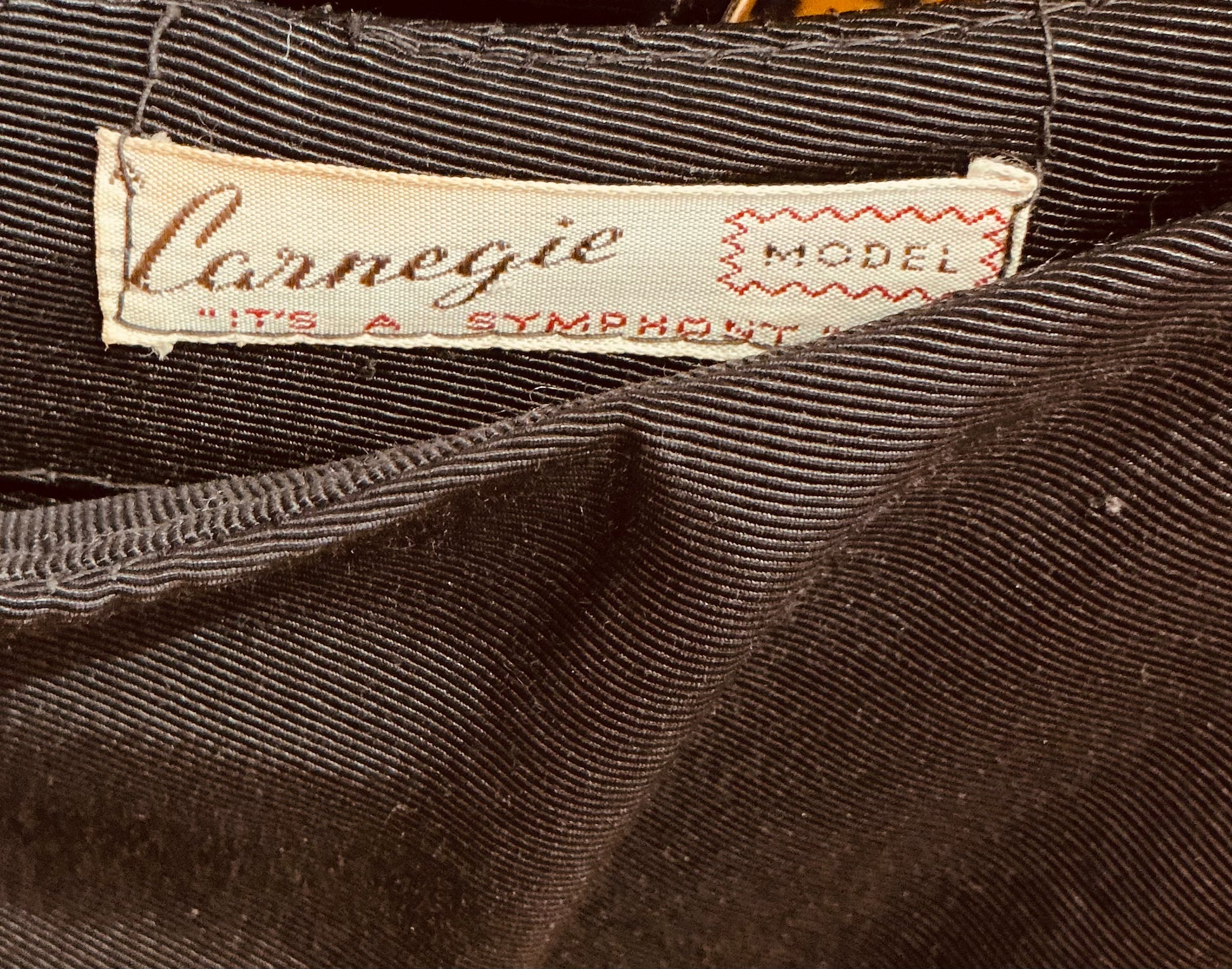 This 1950s Carnegie Designer Black Fit and Flare Dress is a high-quality, original vintage piece that exudes timeless elegance. With delicate embroidery and beading on the front and a charming bow on the waist, this sleeveless dress is sure to turn heads. Bring vintage sophistication to your wardrobe with this timeless dress.