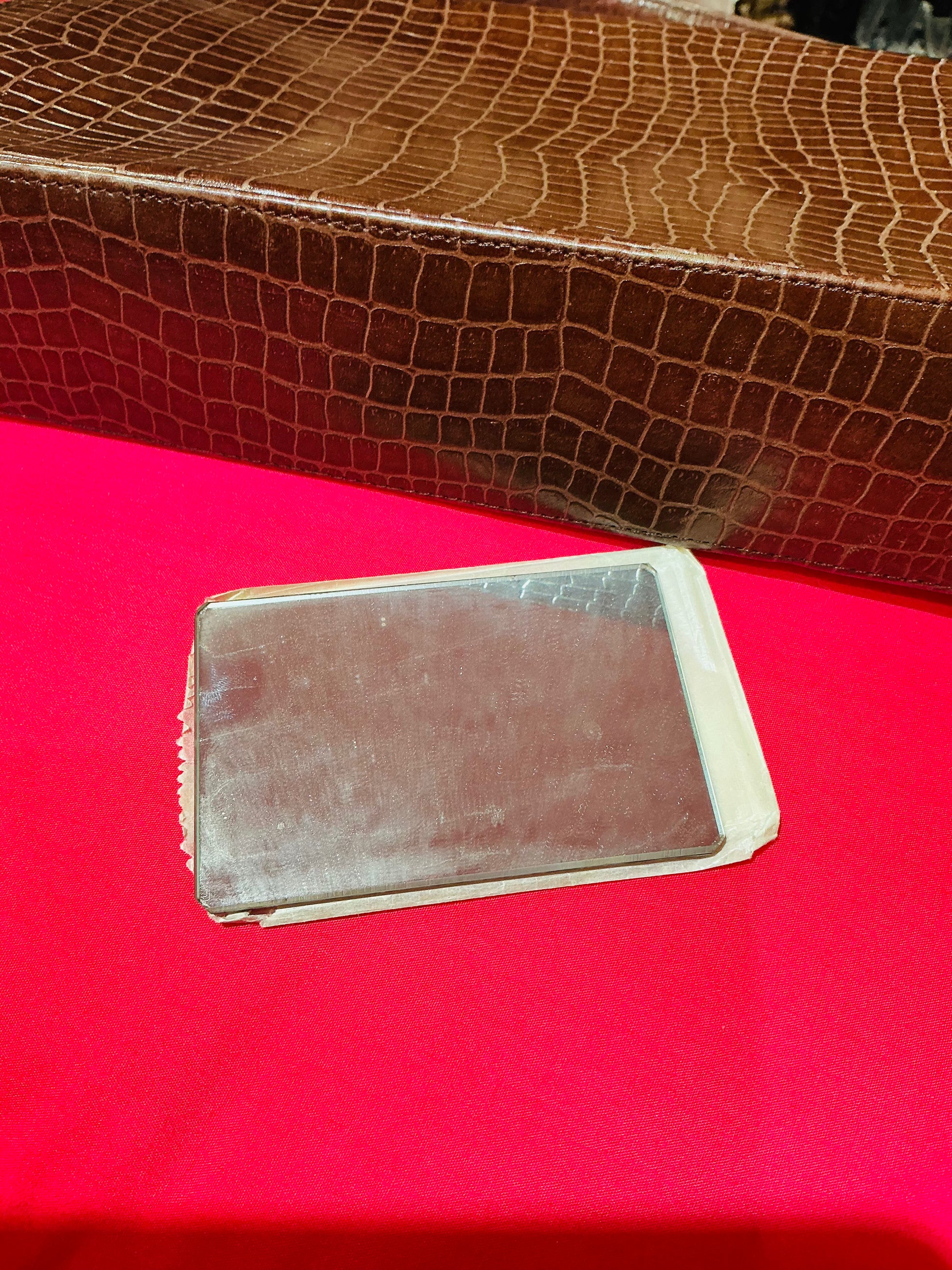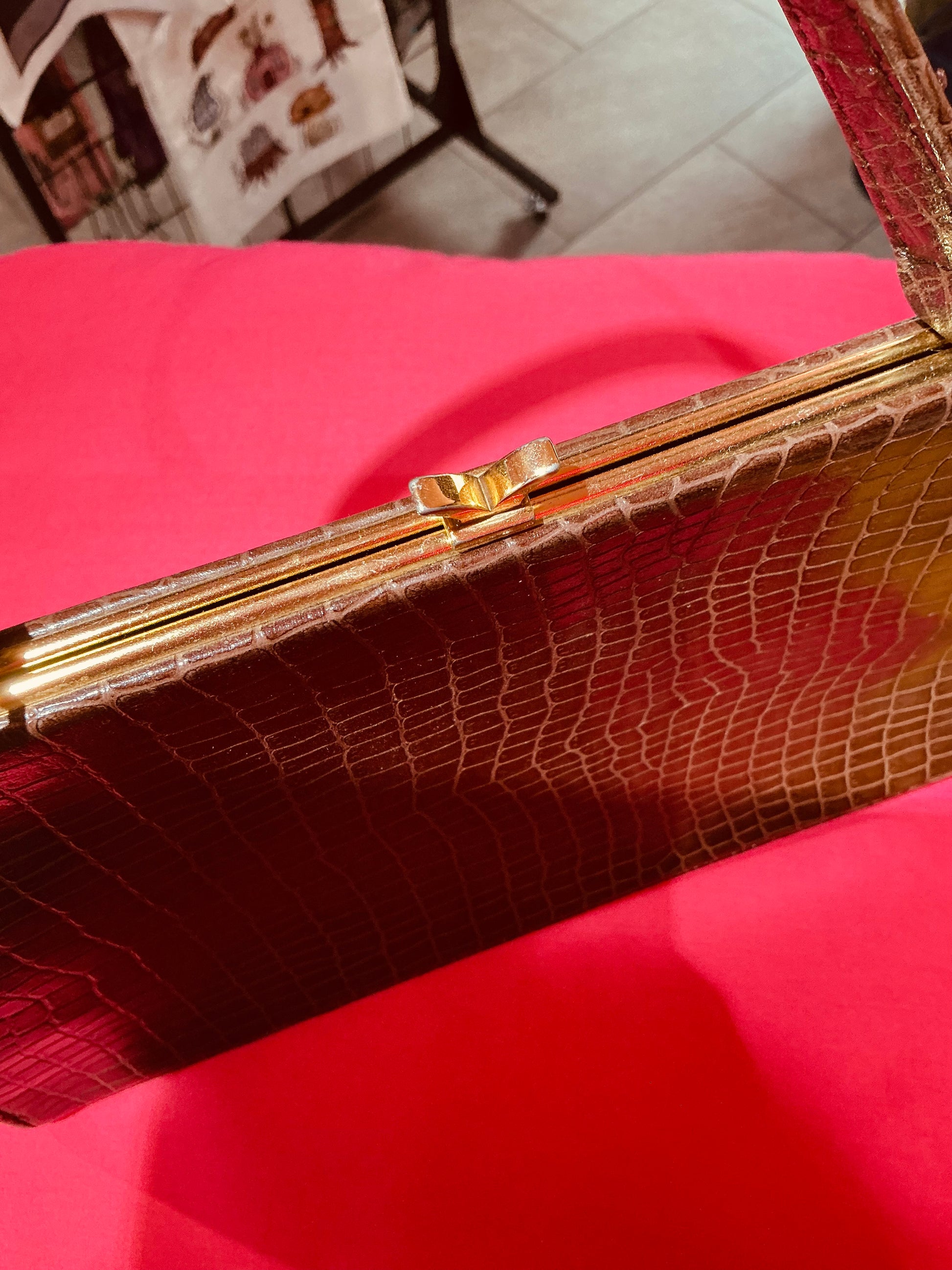 Indulge in timeless elegance with our 1960s Vintage Brown Leather Handbag. Crafted from luxurious leather with a crocodile like pattern, this handbag exudes sophistication. Featuring a delicate gold clasp and an inner pocket, it is perfect for storing your essentials. Don't miss the original mirror in its packet.