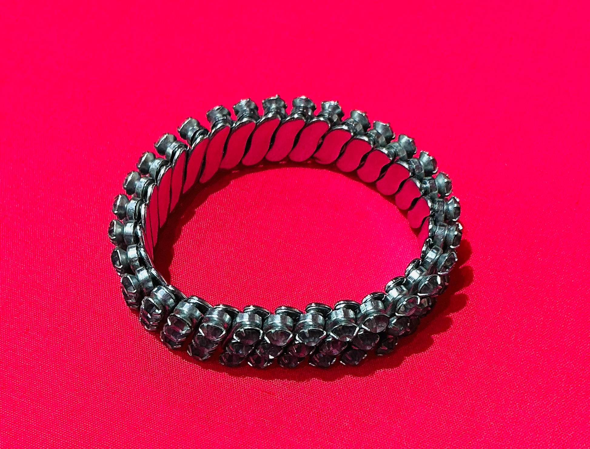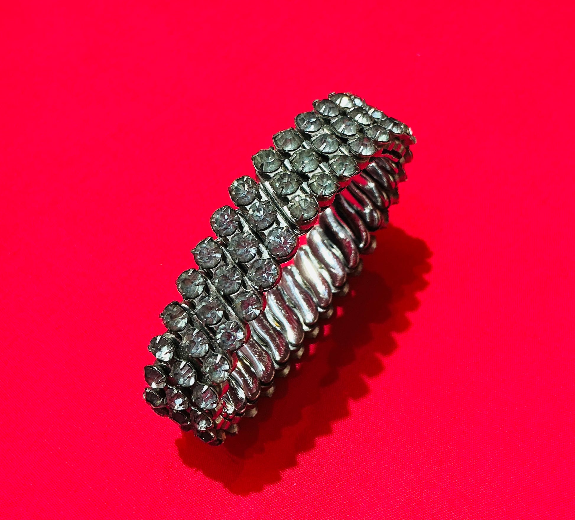 This 1960s Vintage Silver Diamanté Bracelet is in great condition and features a unique stretch design, allowing for a comfortable and adjustable fit. Stand out with this elegant and timeless piece that adds a touch of sparkle to any outfit.