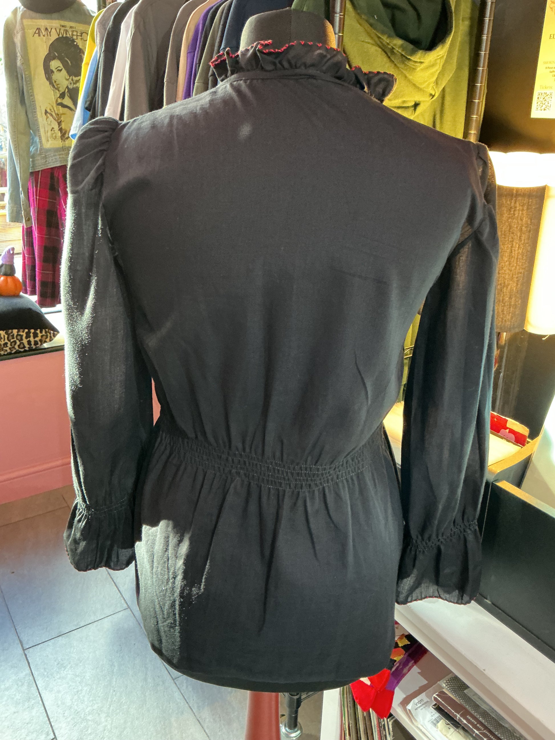 Add a touch of vintage boho charm to your wardrobe with our 1970s-inspired embroidered blouse. Made from lightweight cotton, this black blouse features long, puffed sleeves for a feminine and airy look. Perfect for a day out or a night on the town.