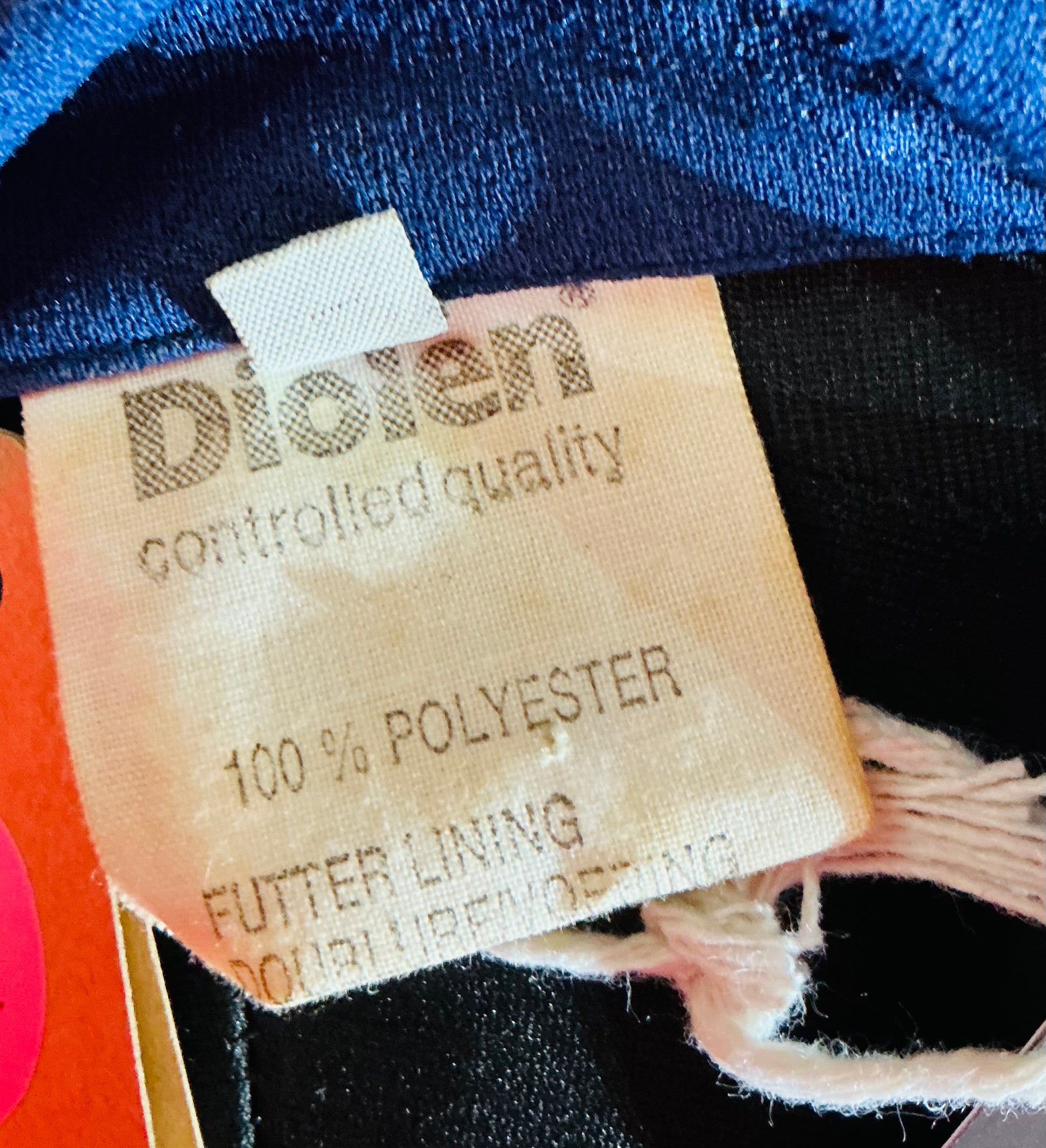 This 1970s vintage Diolen navy blue pleated midi dress is sure to make a statement. With its elegant embroidery detail and flattering waist tie, this dress is perfect for any occasion. Despite some slight wear and bobbling, it remains in good condition and promises to be a timeless addition to your wardrobe.