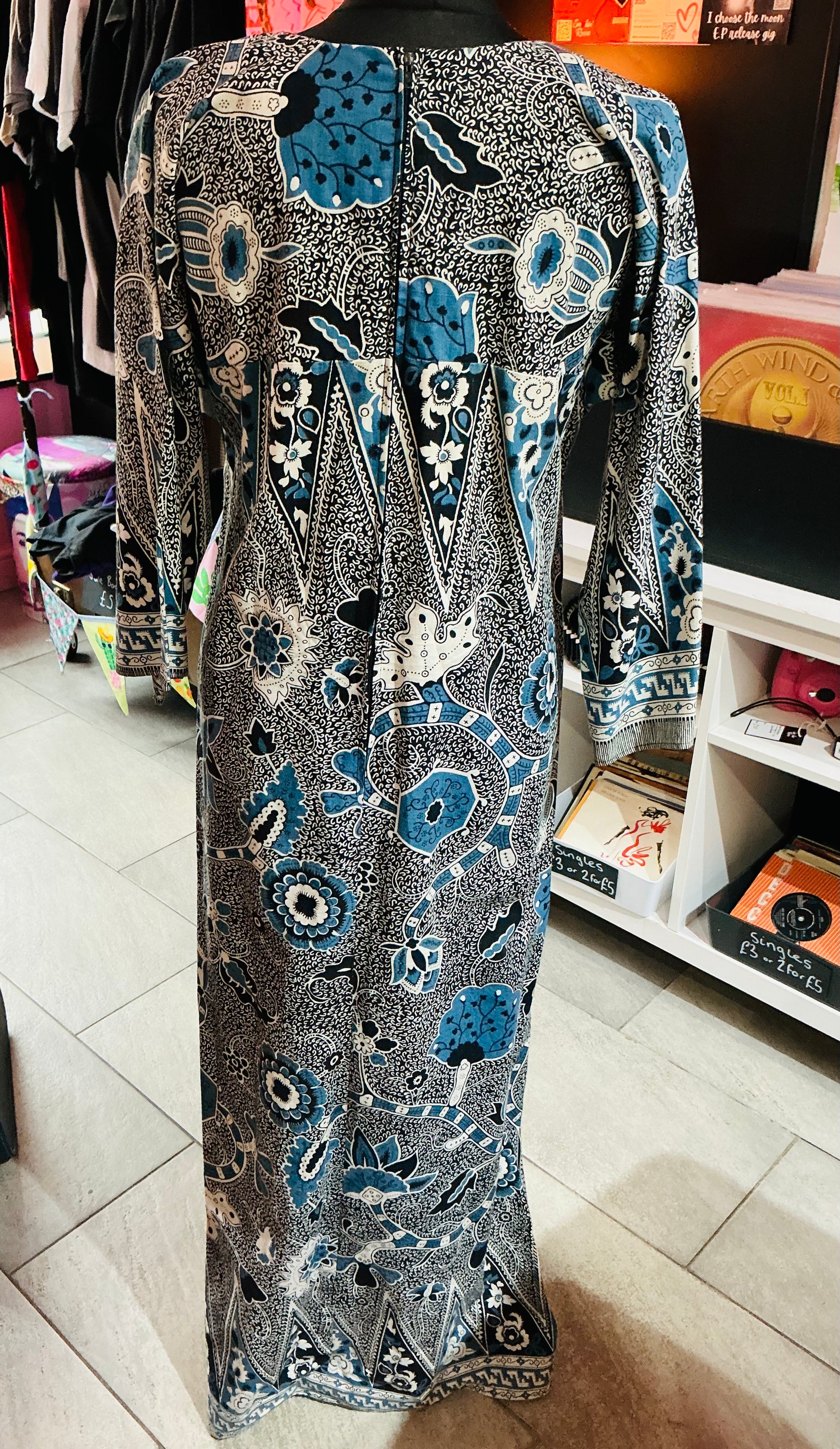 Experience the timeless elegance and comfort of our 1970s Vintage St Michael Kaftan Style Floral. Made with soft cotton, this retro kaftan features a v-neck, wide sleeves, and an oversized skirt for a relaxed and flowy fit. The intricate blue, white, and black floral design adds a touch of sophistication to your wardrobe.