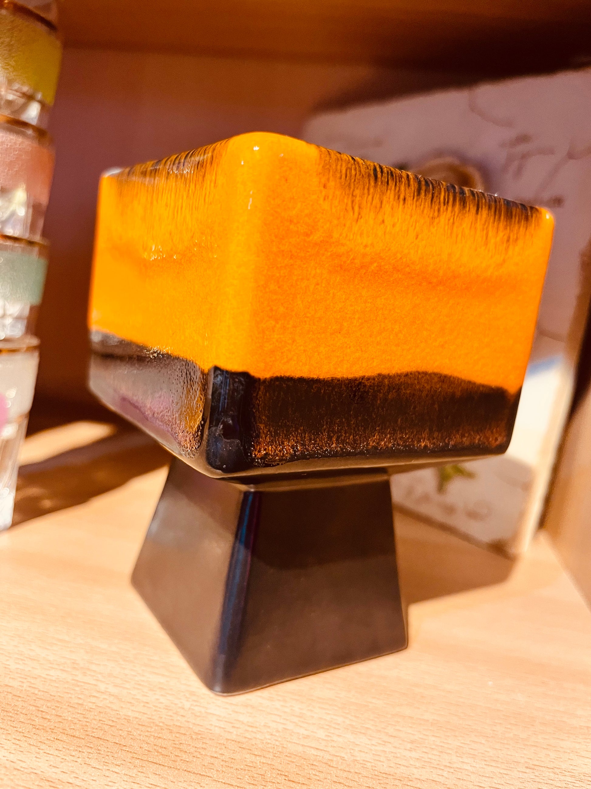 The 1970s West German Orange and Black Vase is a small, cube-shaped ceramic piece that exemplifies retro chic design. Its distinctive color combination enhances modern decor, while its alternative form offers a unique aesthetic. This vase is ideal for creating focal points in minimalist or vintage-themed spaces.
