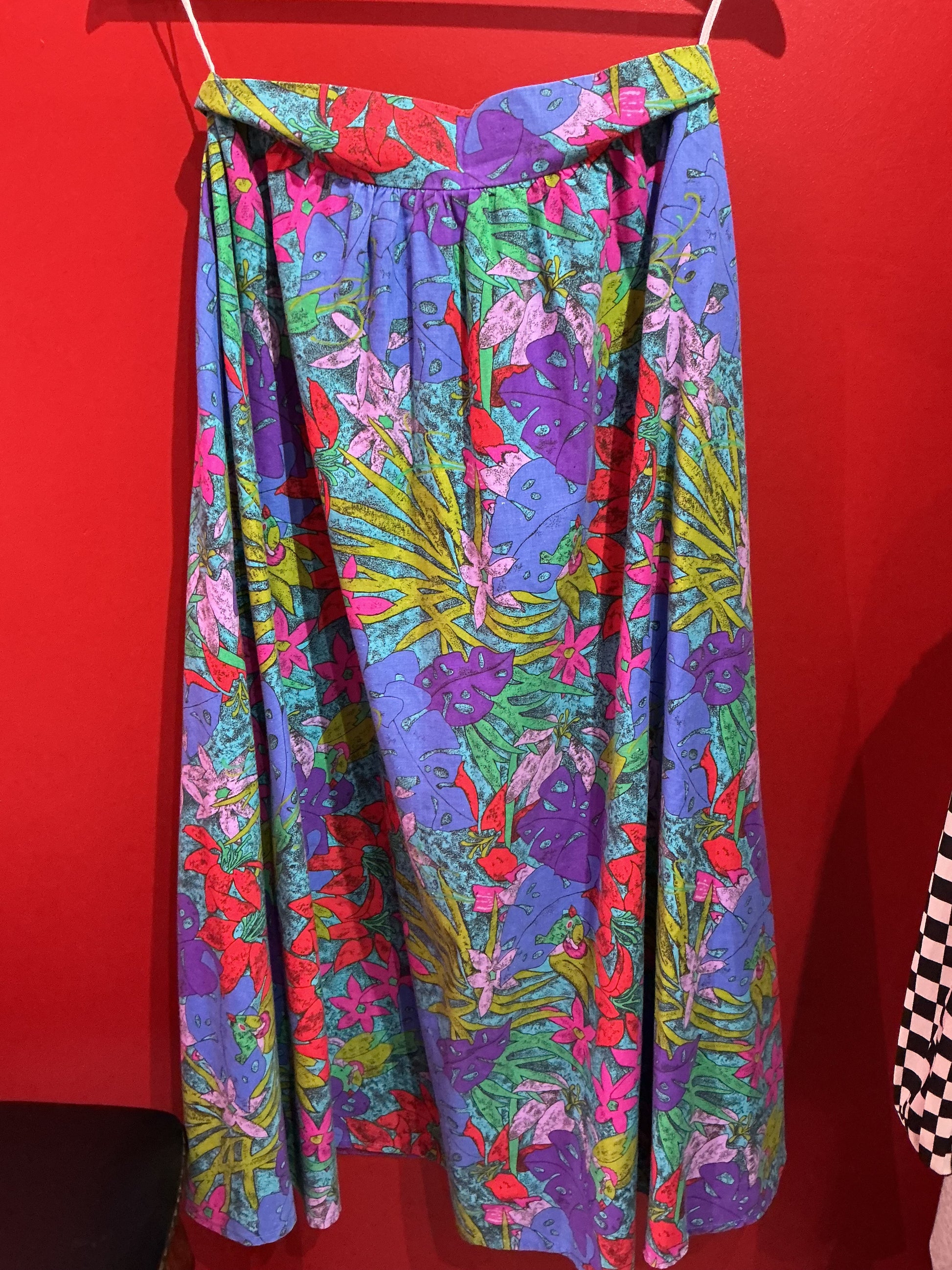 This 1980s USA Vintage Nightingales Bright Patterned Circle Skirt offers a comfortable fit and high-quality vintage design. The bright, eye-catching pattern adds a touch of nostalgia to any outfit. Perfect for adding a unique flair to your wardrobe.