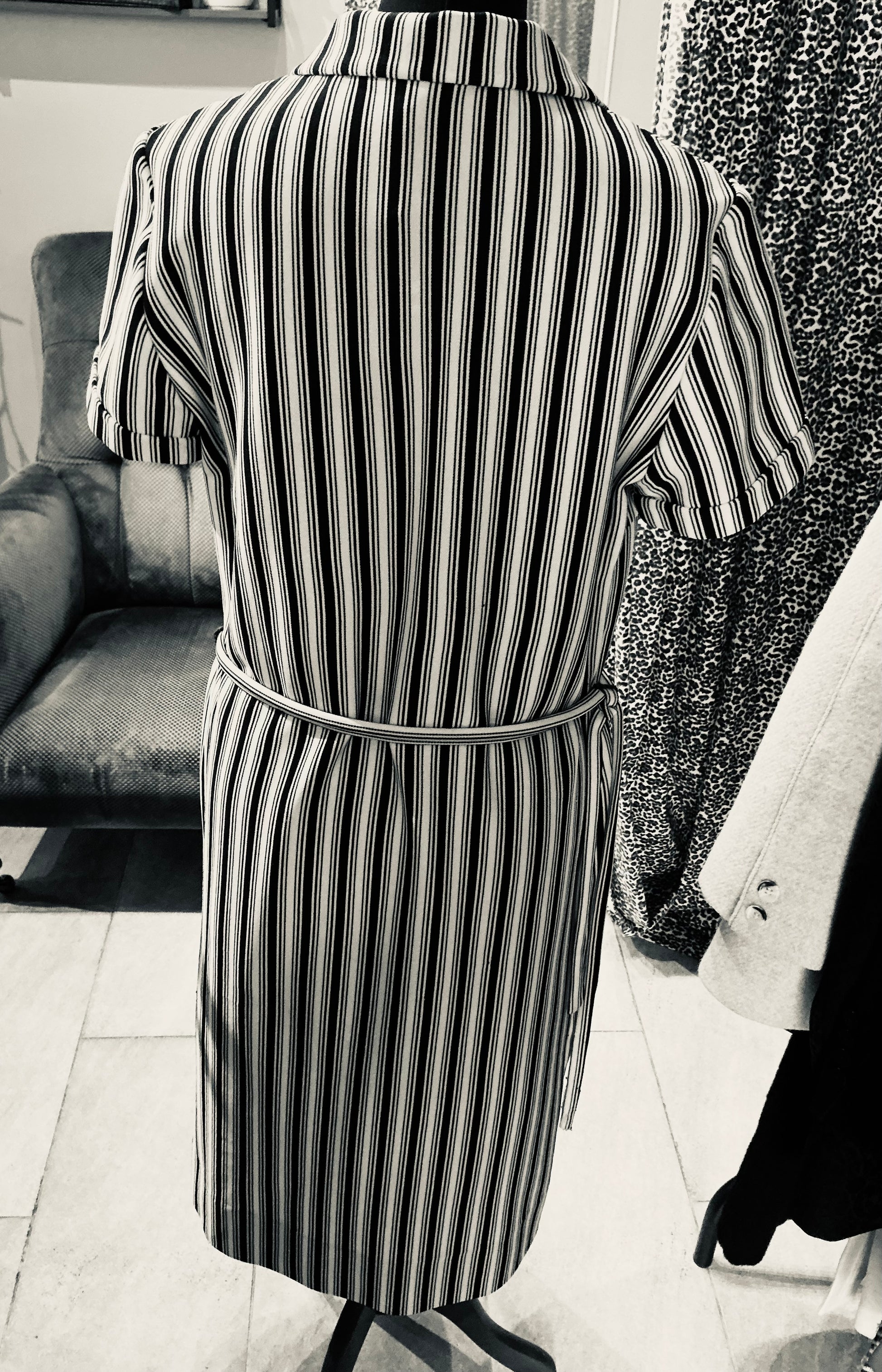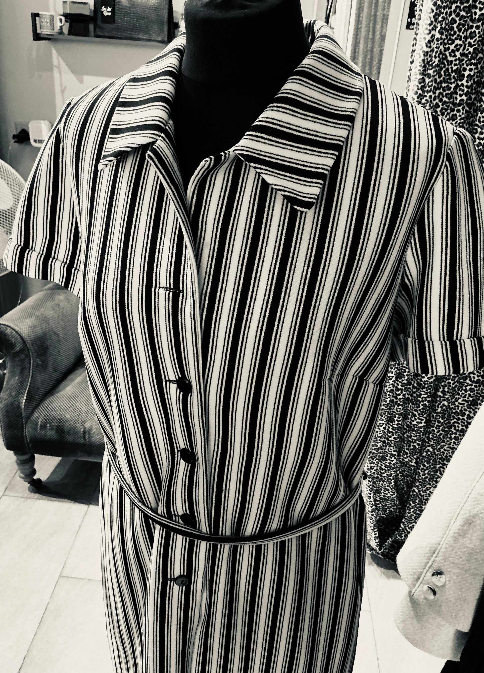 This 1980s Vintage C&A midi skirt is a timeless piece with a black and white striped design. While it may have a slight mark and missing button, it remains a stylish and versatile addition to your wardrobe. Perfect for any occasion, this skirt offers a unique vintage charm that will elevate any outfit.