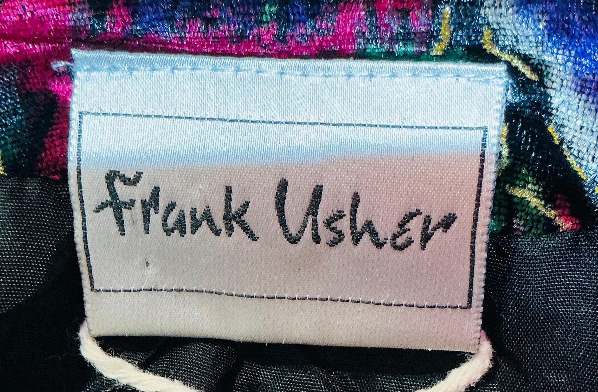 Elevate your wardrobe with this one-of-a-kind 1980s Vintage Frank Usher Gold Glittery Floral Jacket. Made with pink and purple flowers, gold details, and shoulder pads, this original vintage piece adds a touch of glamour to any outfit. With long sleeves and a waist-sitting length, it's a must-have for any vintage lover.