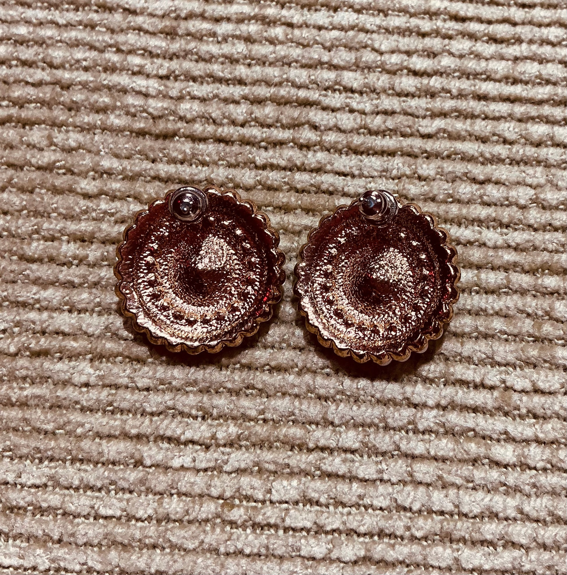 These elegant 1980s vintage circle studs feature a gold color base and stunning pearls, with a touch of blue crystal. The large size adds a bold and glamorous touch to any outfit. A must-have for those who appreciate timeless and sophisticated fashion.