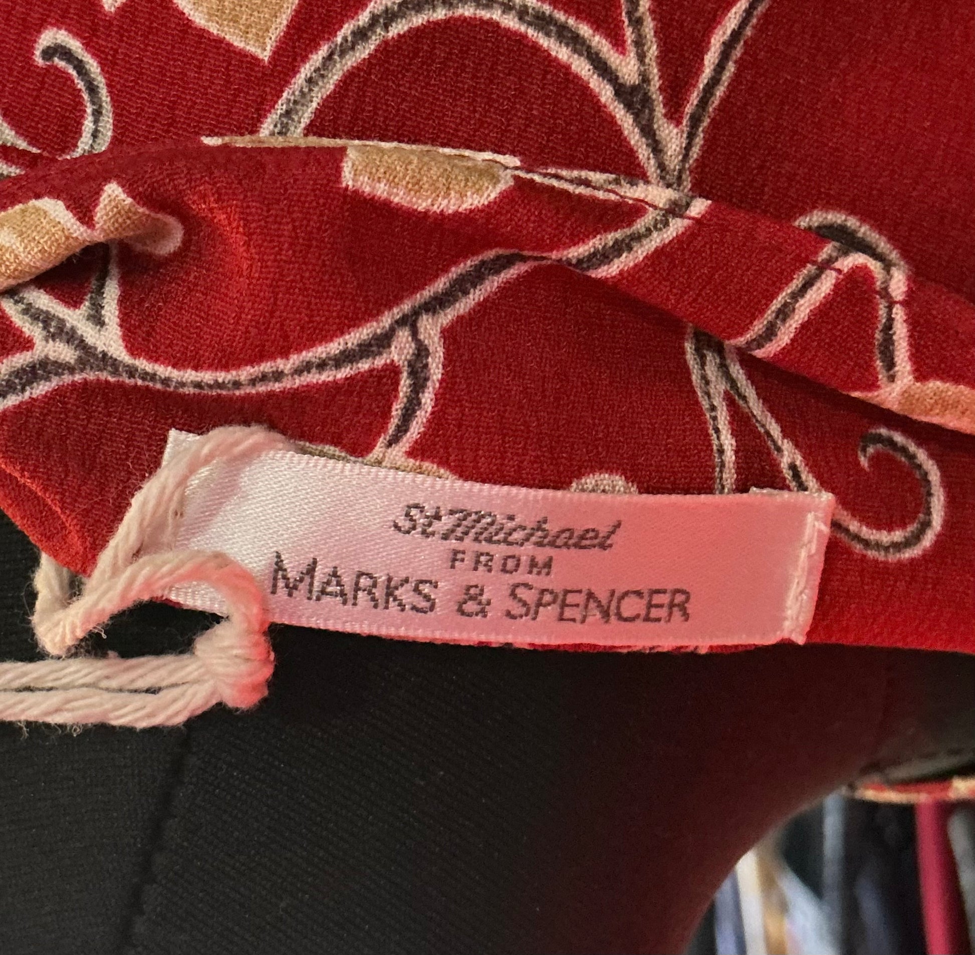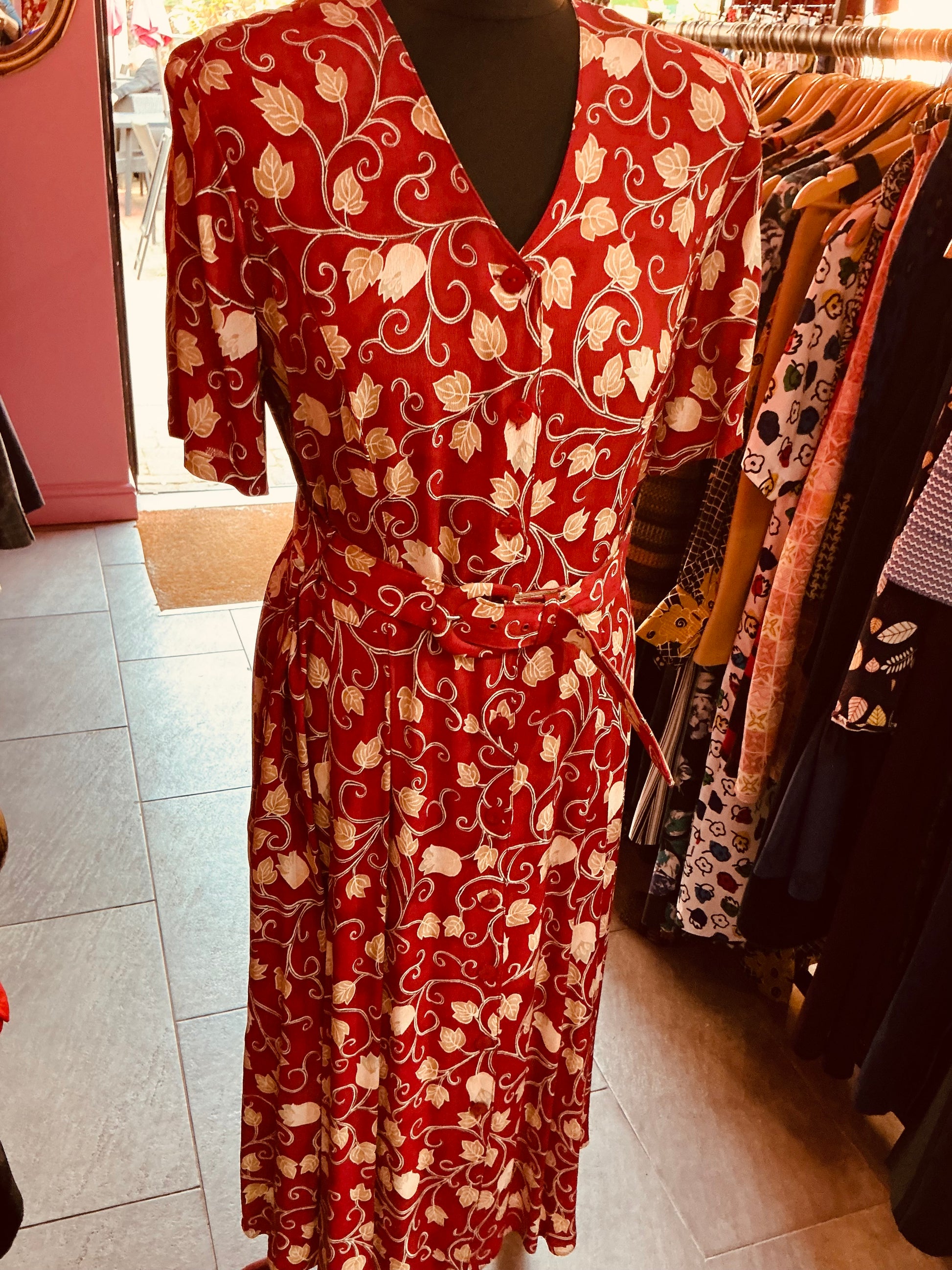 1980s Vintage St Michael Bugundy Leaves Mdi Dress with Belt