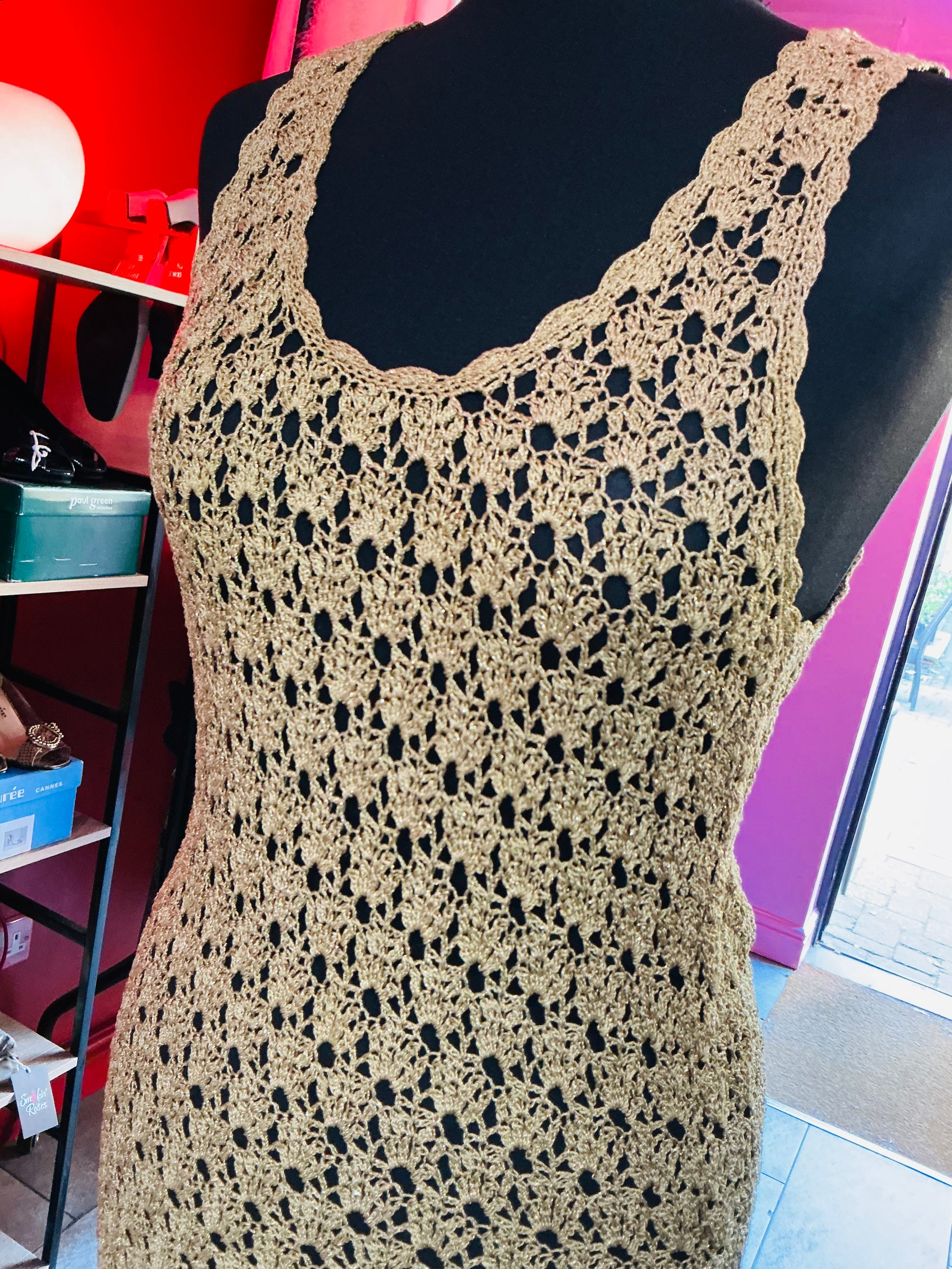This 1990s Vintage Principles Gold Crochet Slip Dress is a great layering piece from Principles at Debenhams. With gold glitter detail and a sleeveless design, it adds just the right amount of sparkle to any outfit. Perfect for a formal event or a night out.