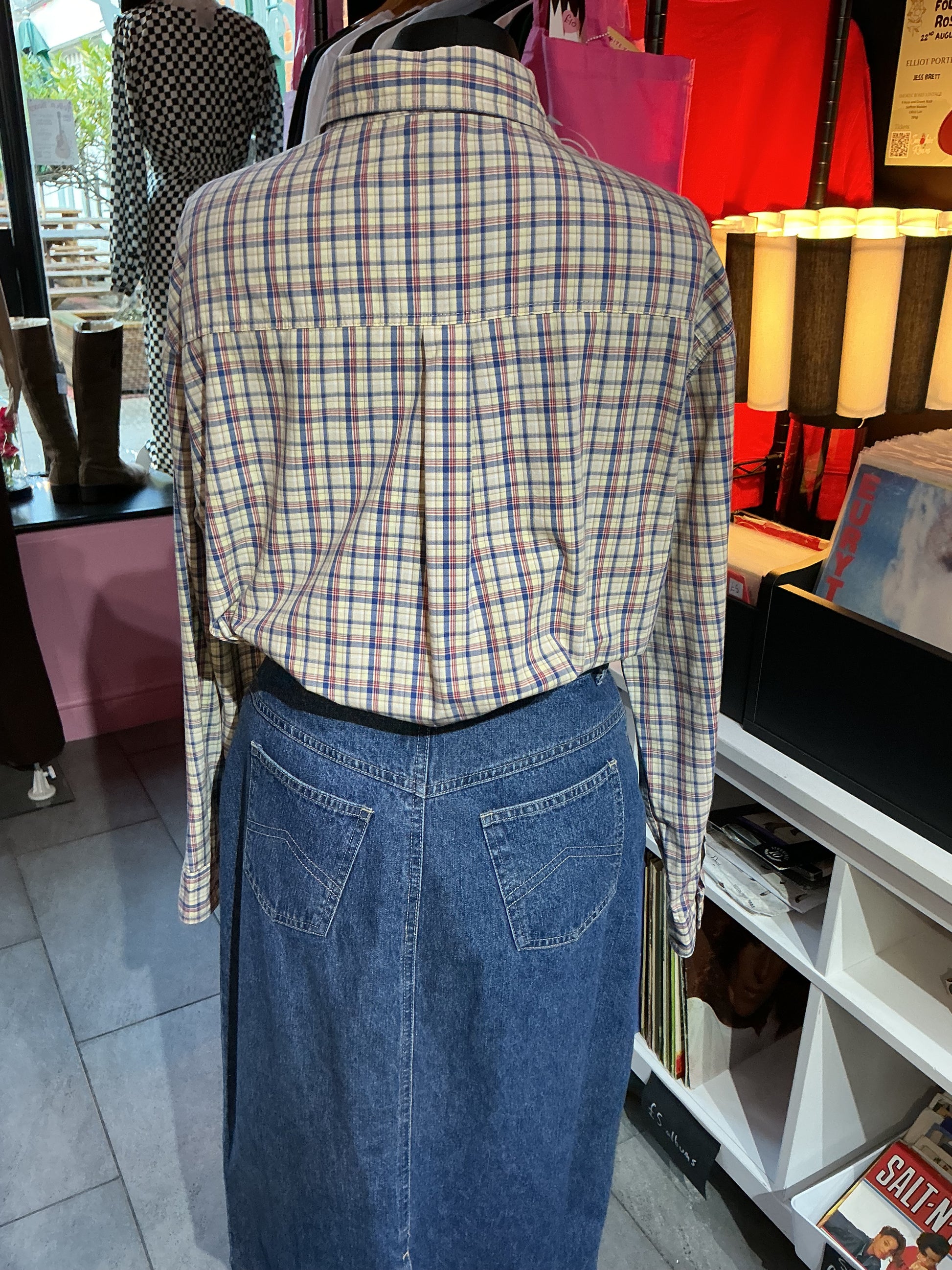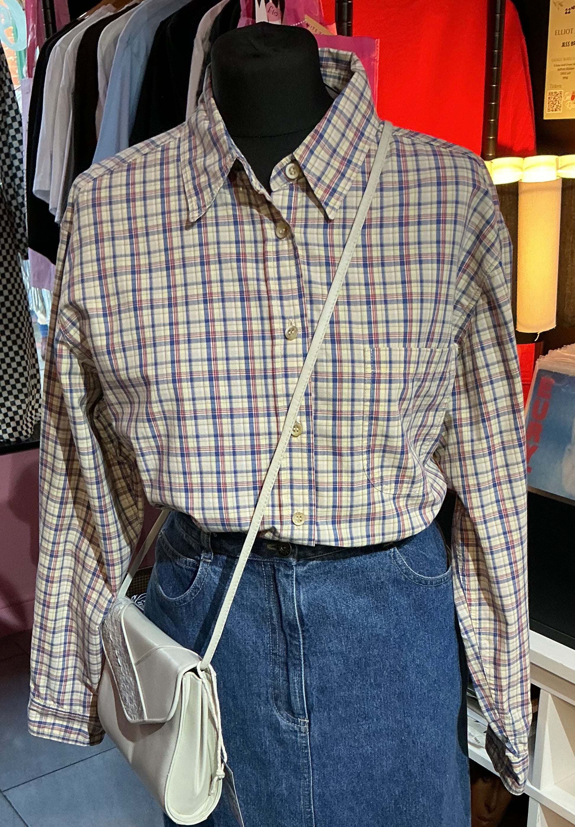 The 1990s Vintage St Michael Checked Shirt features a cream base with a blue and red check pattern, designed in an oversized cut with long sleeves. This shirt offers a blend of vintage style and comfort, ideal for layering or standalone wear, providing versatile options for contemporary fashion.