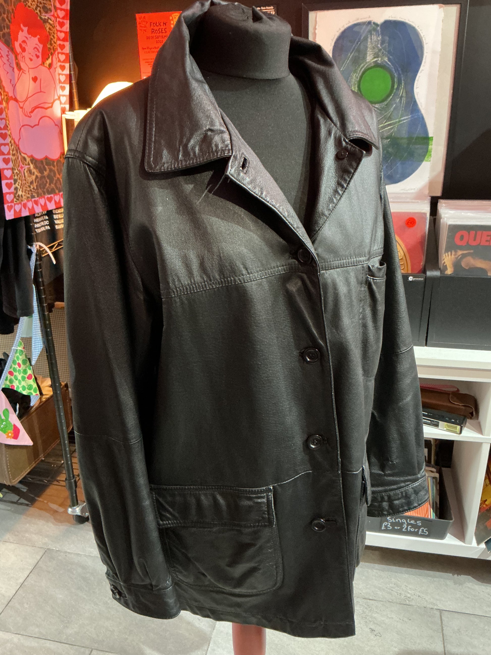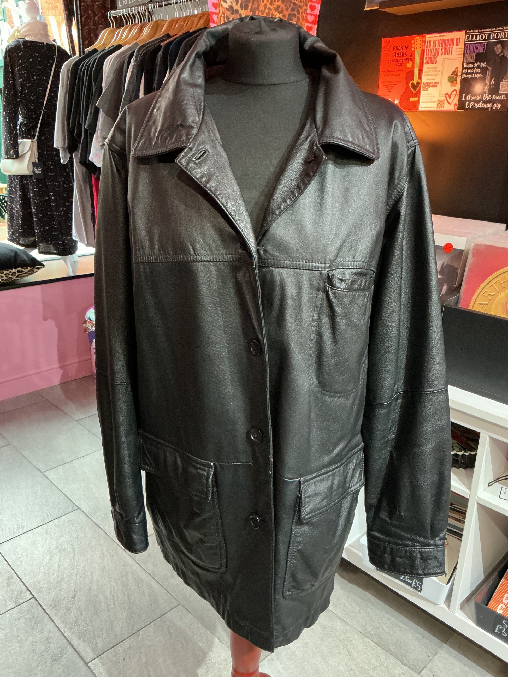 Experience the style and quality of the 1980s with our Black Leather Freemans Jacket. Crafted from soft black leather, this hip-length jacket exudes elegance and sophistication. Available in size 20, it is a must-have for any vintage fashionista. Guaranteed to elevate your wardrobe with its timeless appeal.