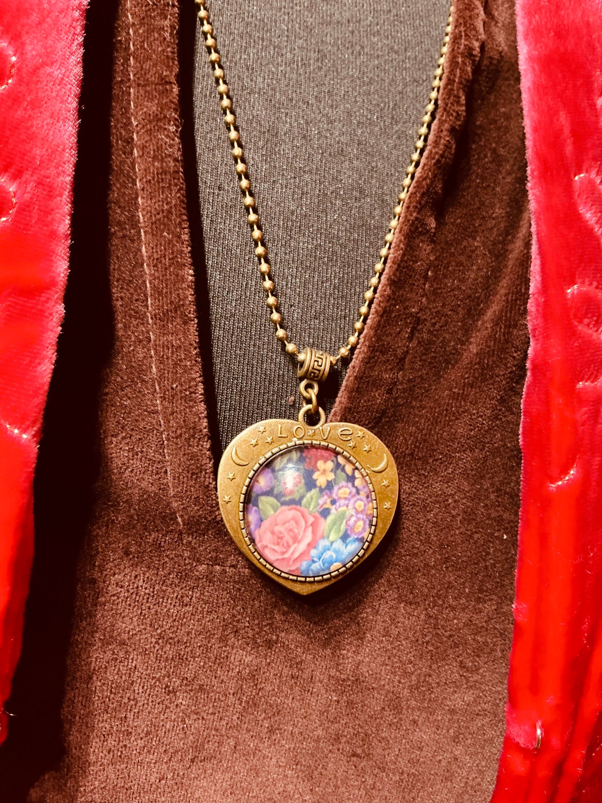 This boho chic heart necklace showcases a clear globe with a delicate rose design, encompassing symbols of love and stars that are embossed in brass. With a mid-length chain, this necklace adds a touch of floral elegance to any outfit.