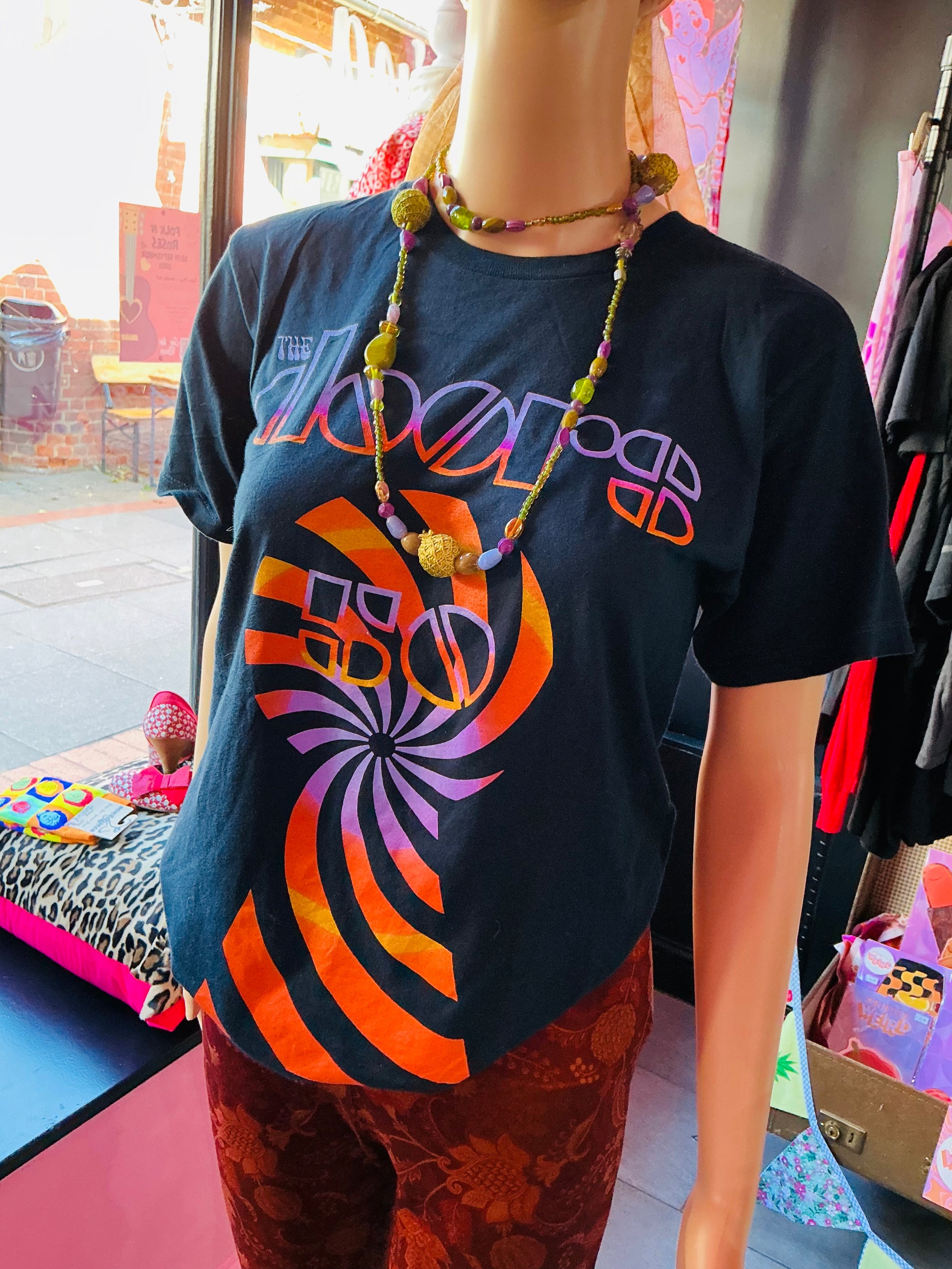 This fully licensed top features the iconic Doors logo in a vibrant purple and orange design, taking inspiration from the psychedelic aesthetic of the 70s. Show your love for this classic band with this unique and retro top.